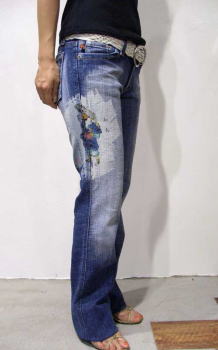 | アメリカ製のデニムパンツに、江戸行商百姿のプリントを施してみました。色は一点一点、職人による手差しのハンドペイント。そんな訳で色の仕上がりは、他にはない世界にひとつのアイテムです。 |
